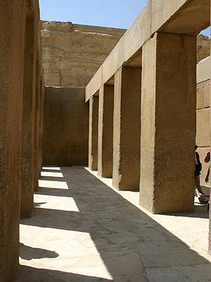 Наиболее четкое представление о заупокойных храмах при пирамидах в Гизе дают остатки храма при пирамиде Хафра (прямоугольное здание с плоской крышей). В этих храмах впервые встречаются свободно стоящие столбы. Сами здания декорируются сочетанием отполированных плоскостей различных камней.